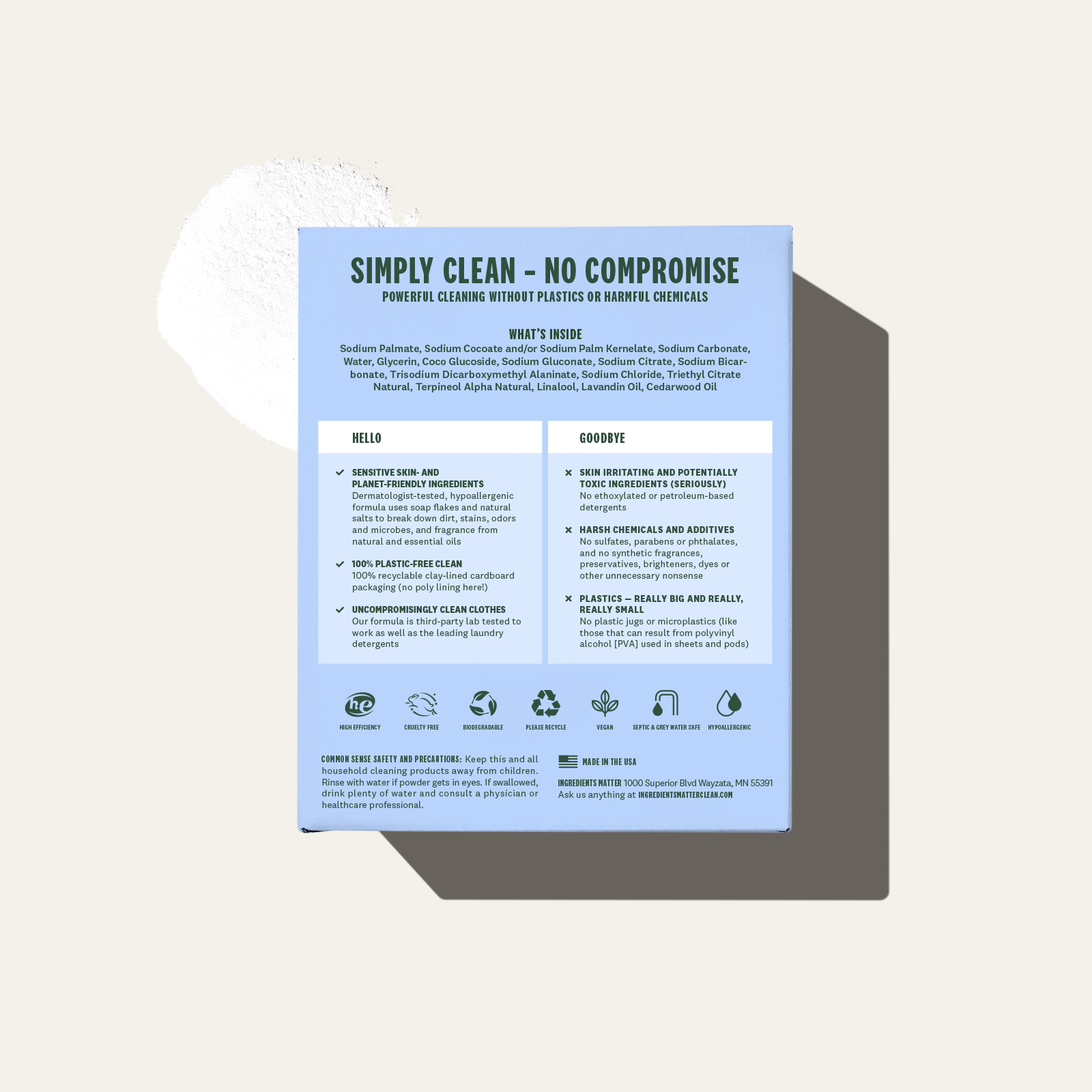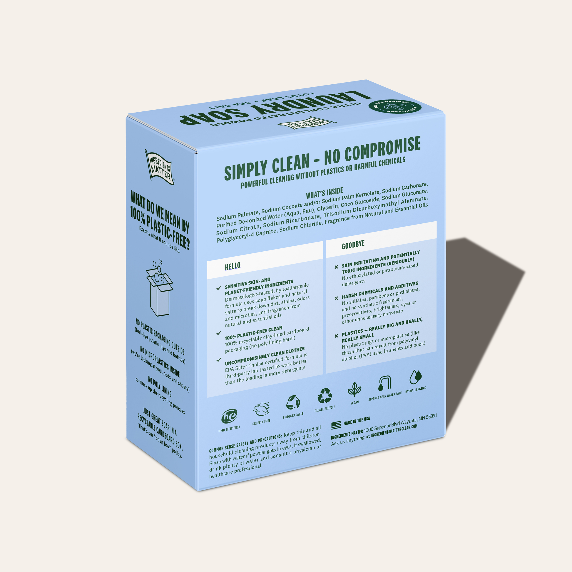Our clay-lined box keeps every part of the package recyclable, with no bulky jugs or sneaky poly liners breaking down into microplastics.